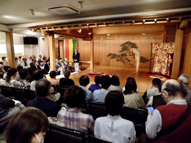ふたを開けると定員の115席が満員と予想以上、期待以上の盛況に、部員一同先ずは安堵!石渡氏にご挨拶を頂いた後、同法人業務理事観世流仕手の中森貫太先生による講話は、能の歴史、内容、使用するお面、髪飾り、扇などの道具類について時間を忘れるほどの極めて丁寧な興味深い解説だった。