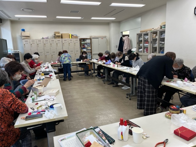 令和6年1月31日(水)鎌倉市福祉センター団体活動室において10時~15時まで20名の参加者で布地は絹を使ってチクチク針仕事。