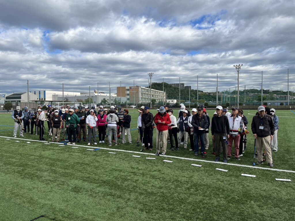 親善グランドゴルフ大会を11月7日、笛田公園野球場で開催しました。参加者は、みらいふる鎌倉36名、栄区シニアクラブ連合会37名の合計73名でした。当日は素晴らしい天候に恵まれ、熱戦が繰り広げられました。開会式で、みらいふ